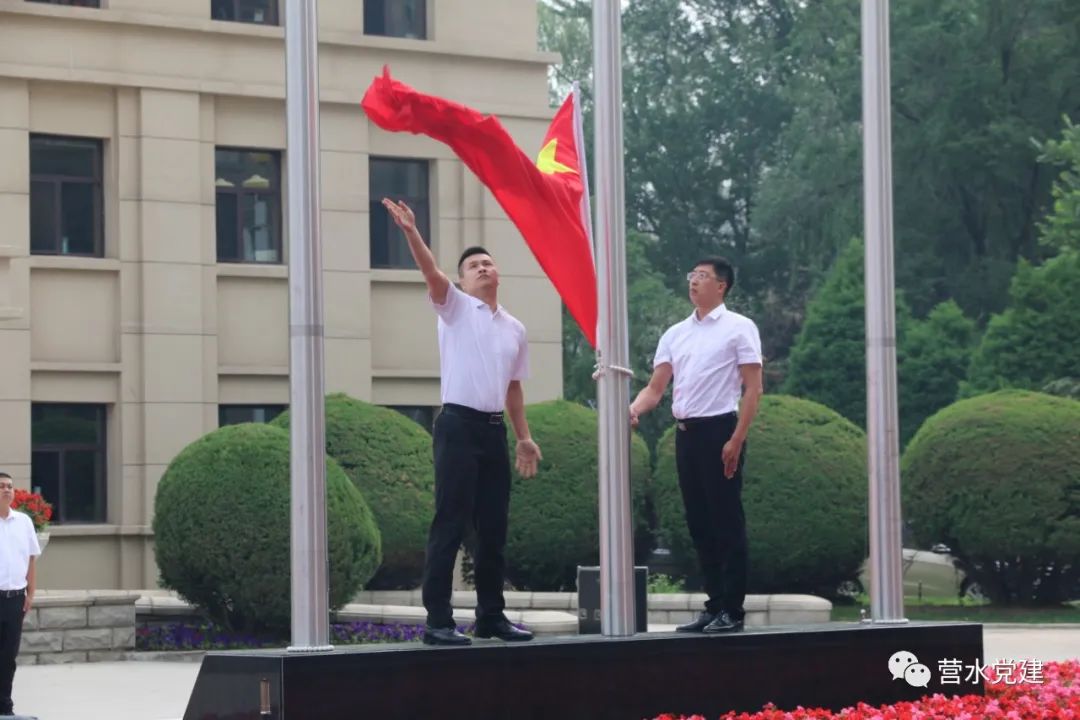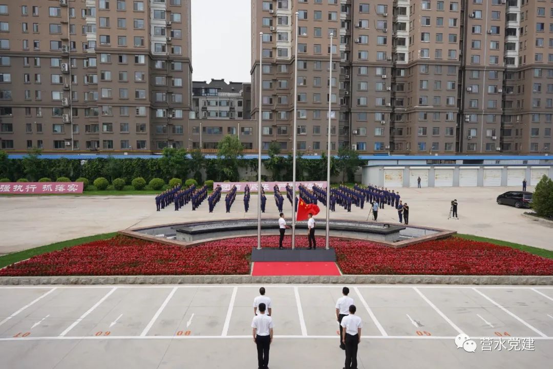 全體黨員整齊著裝,在辦公樓前列隊,英姿颯爽的護旗手邁著鏗鏘有力的步伐,托舉五星紅旗走向升旗臺。
